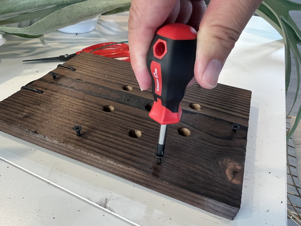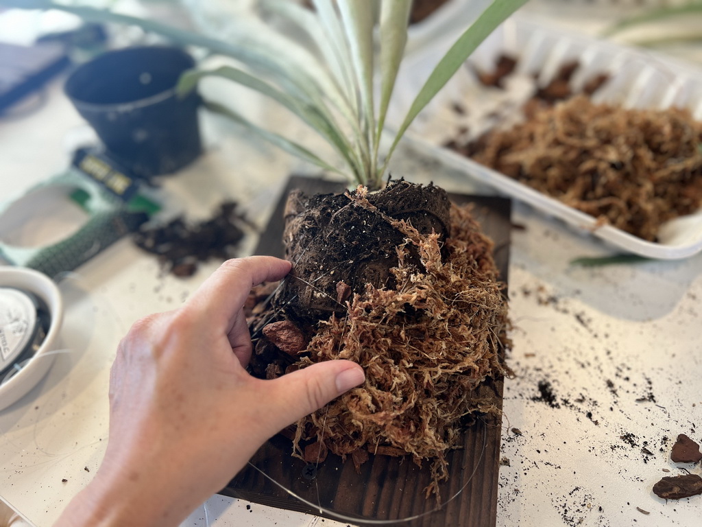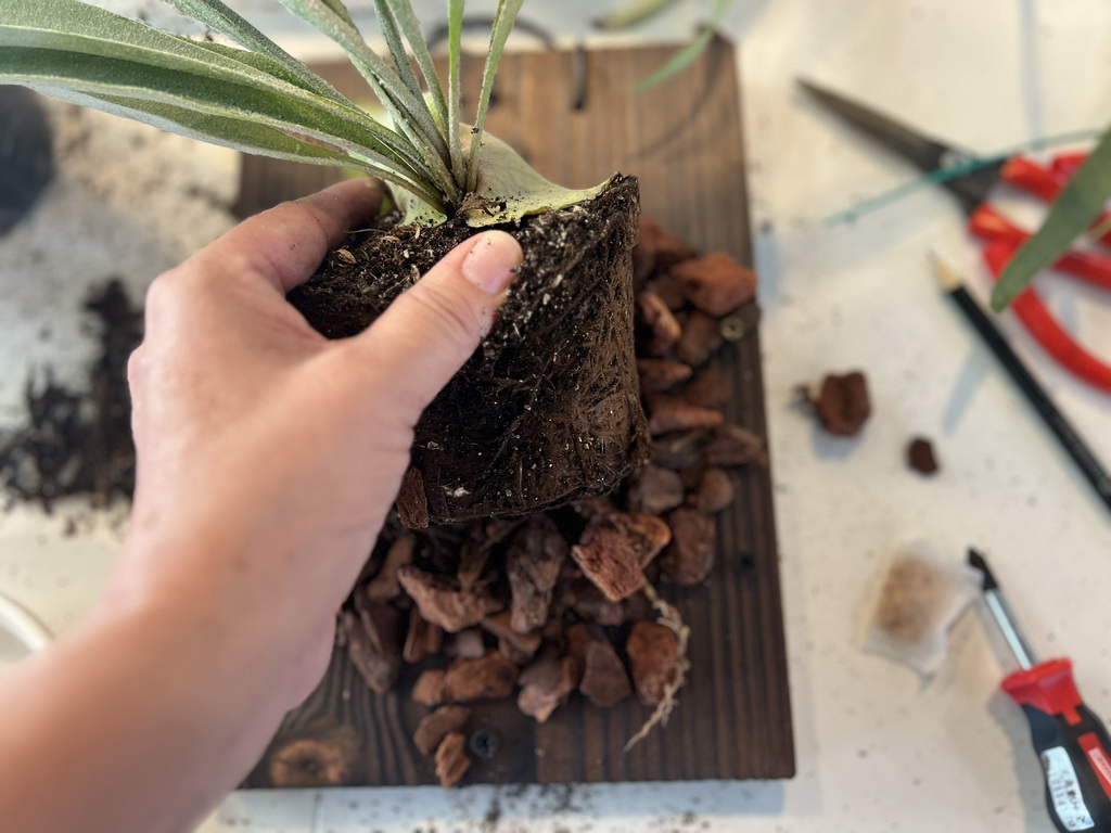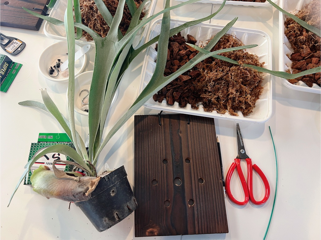 鹿角蕨上板真的超療癒,我們先是將螺絲鎖在板上,再使用水苔、樹皮塊用釣魚線將植株固定上板,整個纏繞的過程像是在幫鹿角蕨穿衣服,一邊繞魚線、一邊整理水苔與樹皮塊,最後看著它固定在木板上,完成品超有成就感!