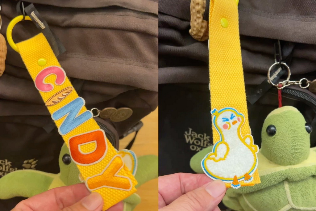 我選了行李吊牌,再挑選幾個大寫的英文字母拼排出「CINDY」的名字,再加上一隻可愛的大肥鵝,不只療癒,還很實用!