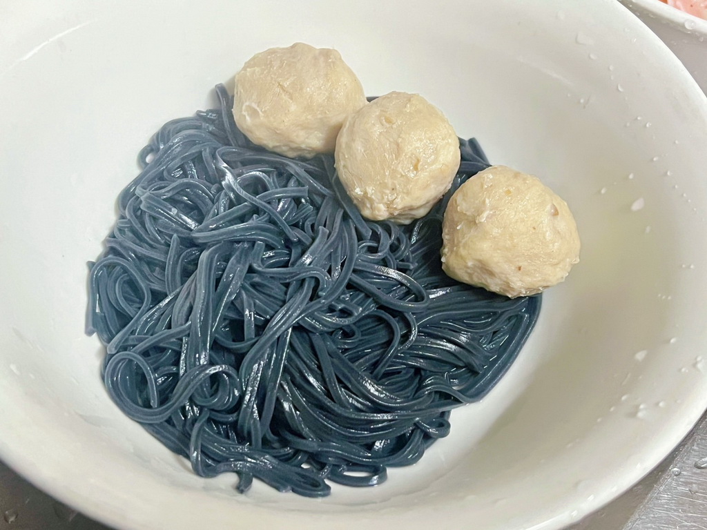 靈機一動,就決定今天就來個升級版:牛肉湯麵加貢丸!把冰箱裡的慶豐新竹貢丸、竹炭麵和火龍果刀削麵一起下鍋煮,淋上昨天的湯底,不到15分鐘,超有料的湯麵就上桌了。