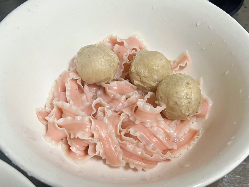 先生一邊吃一邊說:「真好吃!幸好妳有加貢丸,不然我還以為今天要吃素咧!」