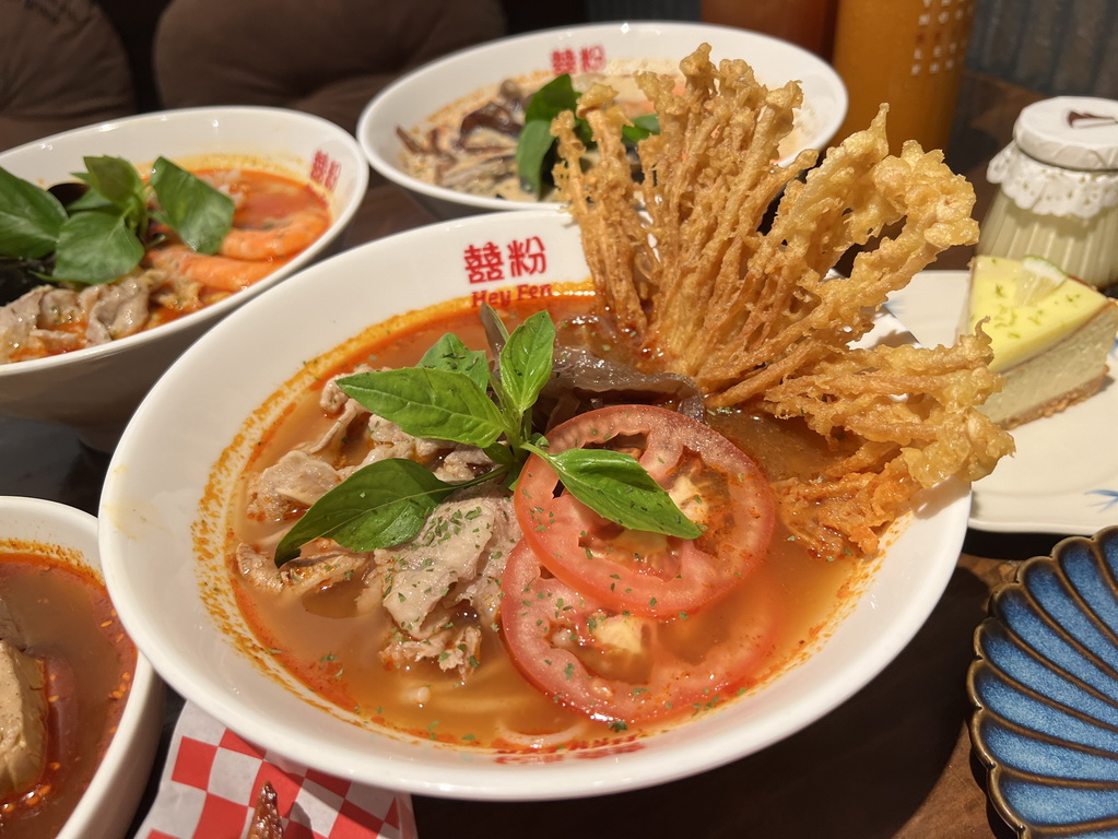 囍粉的湯頭不是單一風味,而是融合泰國、馬來西亞、甚至一點台式靈魂的創意結合,像冬陰功的酸辣、打拋豬的香氣、還有濃郁奶香的馬來叻沙,都能在這裡一次品嚐到。
